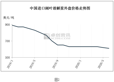 2020年上半年溶解漿價(jià)格窄幅下行,國產(chǎn)闊葉溶解漿含稅到廠價(jià)均價(jià)5377元/噸,較去年同期下降23%。從圖1可以看出今年上半年變化幅度不大,去年四季度漿價(jià)已降至近五年新低,來到國產(chǎn)漿廠生產(chǎn)成本線附近,幾無調(diào)價(jià)空間。2020年一季度受到公共衛(wèi)生事件影響,溶解漿市場交投清淡,國產(chǎn)漿成交價(jià)低位盤整。二季度終端出口訂單減少,溶解漿市場延續(xù)弱勢運(yùn)行,漿價(jià)承壓窄幅下行,5月份國產(chǎn)闊葉溶解漿含稅到場價(jià)下探至5300元/噸。漿價(jià)持續(xù)低迷原因是: