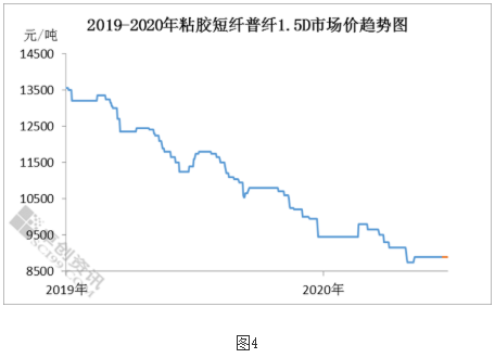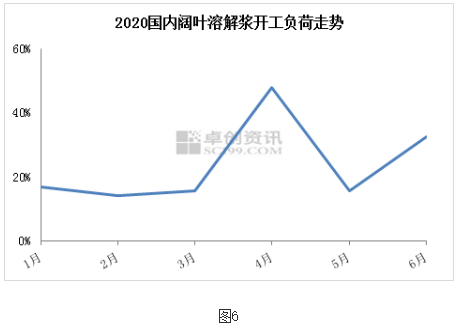 粘短開工率低于同期:如圖5所示,2020年粘短行業(yè)開工負(fù)荷明顯低于去年同期,一季度主要受國內(nèi)公共衛(wèi)生事件和春節(jié)假期影響,二季度則是市場需求收緊,且價(jià)格走低,開工偏弱整理,溶解漿消耗量減少,采買周期延長。