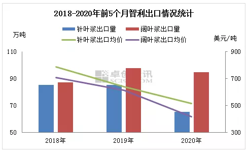 智利海關數據顯示,2020年1-5月針葉漿總出口量65萬噸,較2018年和2019年同期下降25%,而闊葉漿2020年前5個月總出口量94萬噸,較2019年同期下降3%,較2018年仍有上升。可以看出,今年針葉漿出口量出現明顯下滑,而闊葉漿維持穩定。卓創分析主要有以下原因: