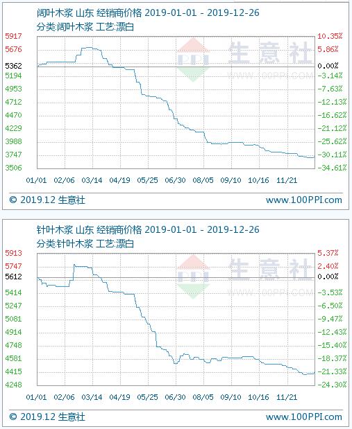 由2019年木漿價格走勢圖可以看出,相較于2018年末價格比較,第一季度木漿價格整體來看稍有上漲趨勢,但是隨著第二季度的到來木漿價格由漲轉跌,而這一波下行則一直持續到了年末,由此看出2019年木漿市場一直處于相對低迷的狀態。